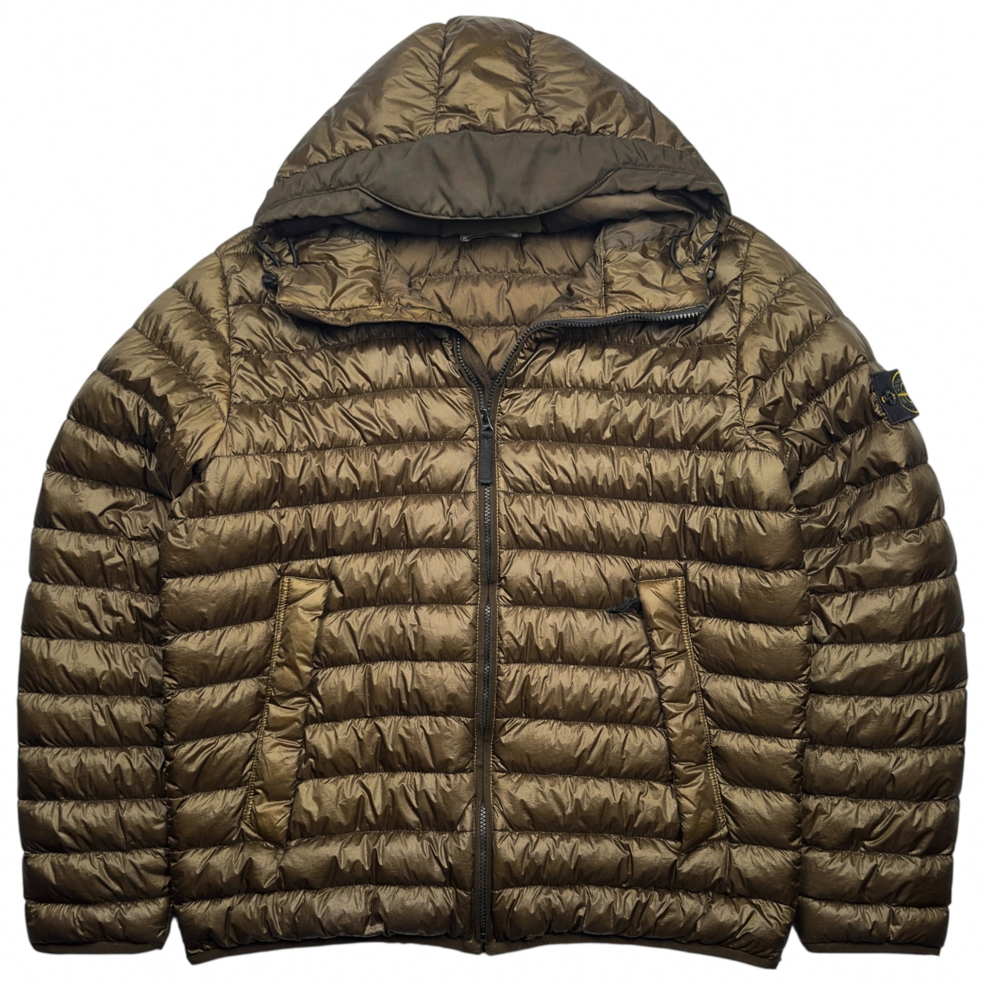 Lightweight Stone Island down jacket crafted from ultra-light nylon weighing only 26 grams per square metre. Garment dyed for a rich colour and finished with an anti-drop treatment for water resistance. Filled with premium down for exceptional warmth while maintaining a lightweight feel. In great used condition.