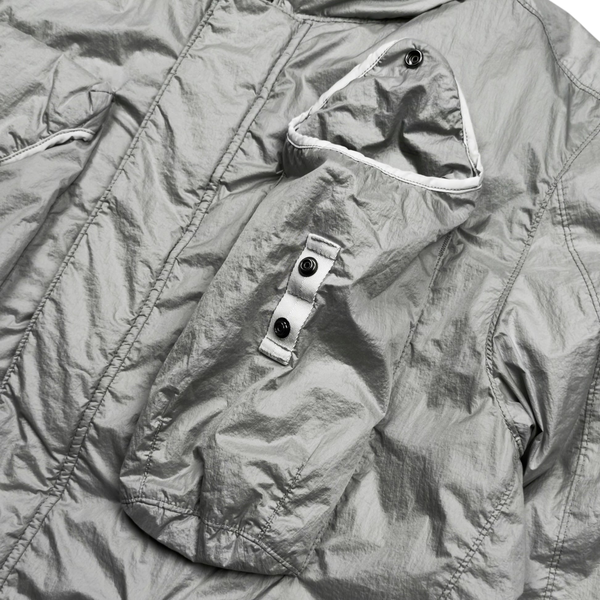 Crafted using C.P. Company’s innovative Nyfoil fabric, a trilobate nylon material with a metallic silver coating on the inside. This jacket provides lightweight thermal regulation and a distinctive reflective sheen. The fabric is garment-dyed, giving the exterior its deep, uneven tone while retaining the high-tech performance of the internal silver layer.