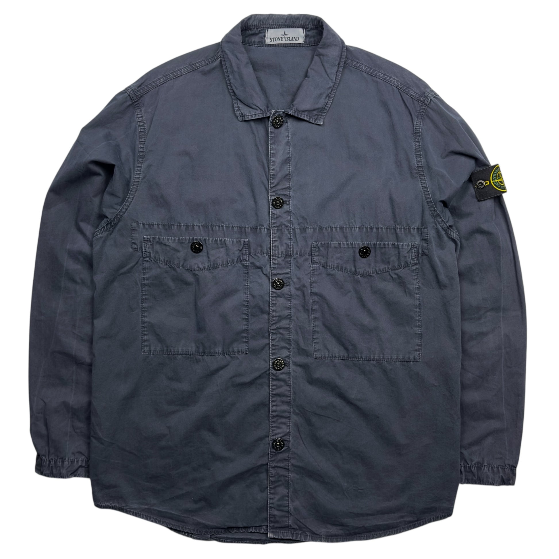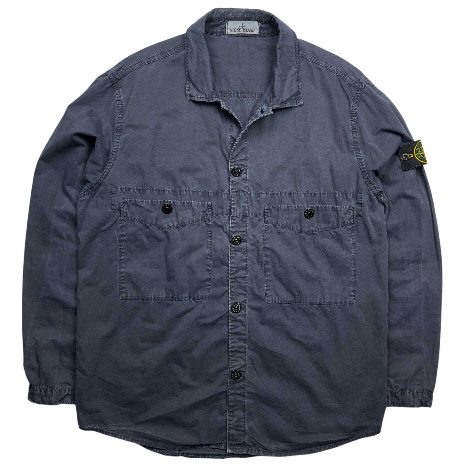 Stone Island overshirt in a garment dyed navy cotton. In good used condition, has some colour fading, this is the only wear.